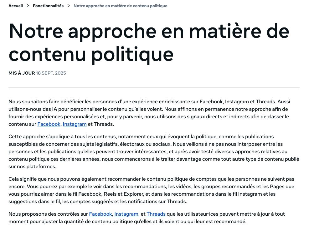 Je croyais que Facebook avait fait une croix sur les contenus politiques mais il semble que ce ne soit pas le cas. Je suis allé voir dans leurs publications récentes et il semble en effet qu’ils considèrent les contenus politiques comme tout autre contenu.