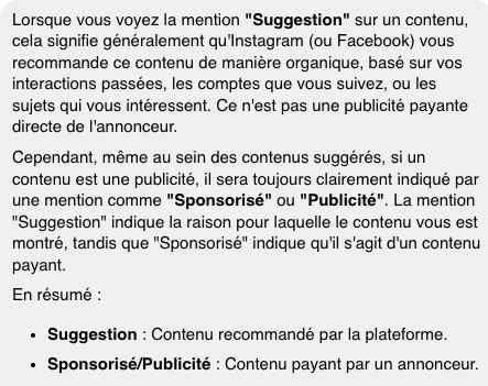 Je me suis alors demandé si les suggestions étaient assimilables à des publicités, c’est-à-dire si la personne qui se voit suggérée payait un montant pour l’être. La réponse de l’agent conversationnel sur le site Meta nous informe que les suggestions ne sont des publicités que lorsqu’il est indiqué que le contenu est l’objet d’un sponsor ou qu’il est une publicité. Sinon ce n’en est pas une. Cela signifie donc que lorsque je reçois une suggestion de contenu de Sarah Knafo, celle-ci n’a pas payé pour ce contenu.