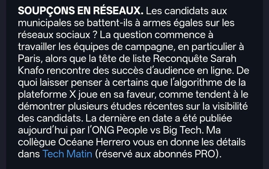 Pour forcer le trait, je dirais que le problème est plus grave qu’une éventuelle faveur accordée à l’extrême droite, que nous pourrions sanctionner et corriger, et qu’il dépasse largement le cas de Sarah Knafo. Le problème est que nous ne pouvons pas apprécier rigoureusement ces recommandations algorithmiques opérées par les réseaux sociaux, étant privés de toute modalité d’examen sérieuse.