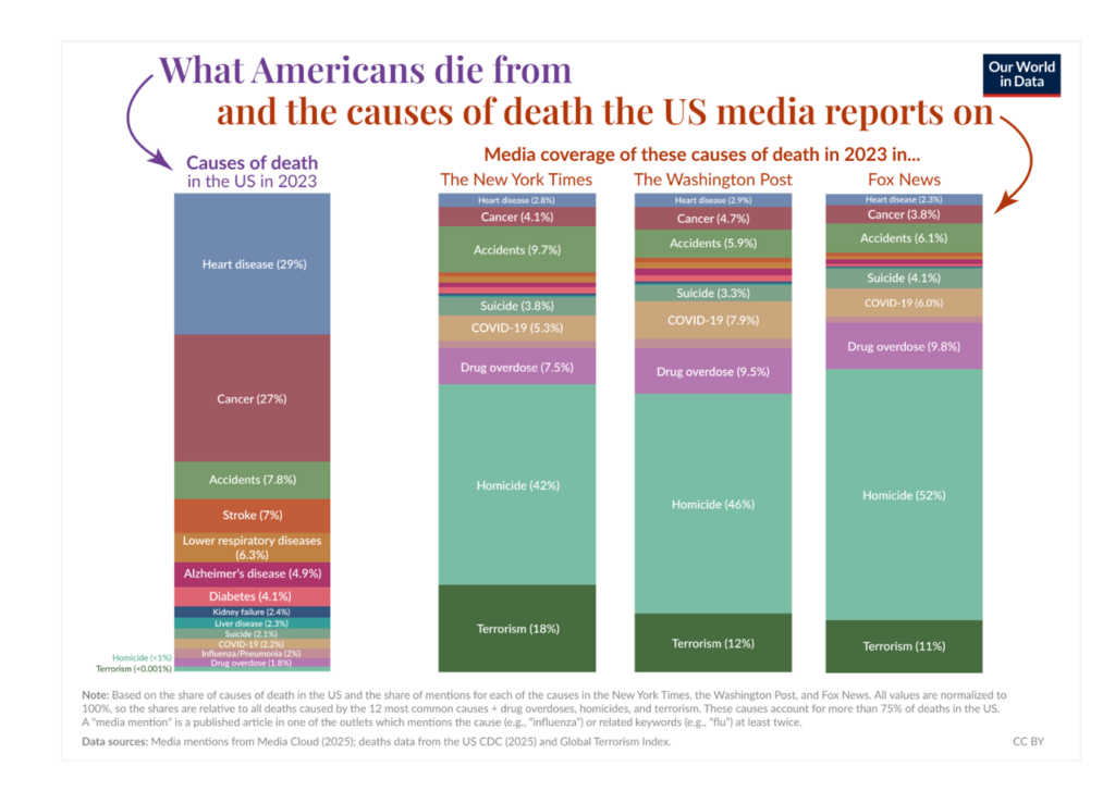 Si bien que notre paysage informationnel traditionnel ne reflète plus du tout la réalité. Une illustration assez patente de cela est cette infographie réalisée par Our World in Data, mettant en vis-à-vis les causes de décès aux États-Unis pour l’année 2023 et celles traitées par la presse américaine. La presse vit dans un monde qui n’est pas celui des Américains ou ne le devient que de manière performative. Il y a une déconnexion totale, de par ce fait médiatique ou l’inverse, je ne saurais dire, des sujets abordés en politique. Et, nécessairement, il y a une déconnexion des électeurs, qui, eux, font face aux véritables causes de décès, tandis que le fait électoral s’en détache totalement.