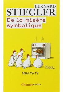 À ce sujet, on retombe sur une des thèses de La Télécratie contre la démocratie de Stiegler : le politique cesse d’être politique le jour où il bascule dans ce mécanisme. Sans oublier De la misère symbolique (Merci Anne Alombert de m’aider depuis cinq ans désormais à naviguer dans les œuvres de Stiegler) dont la couverture est un dessin de presse sur la téléréalité.